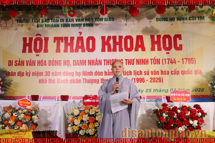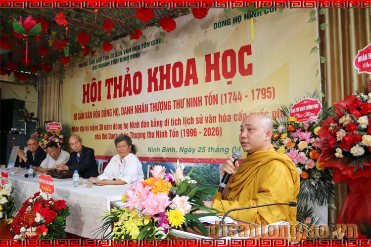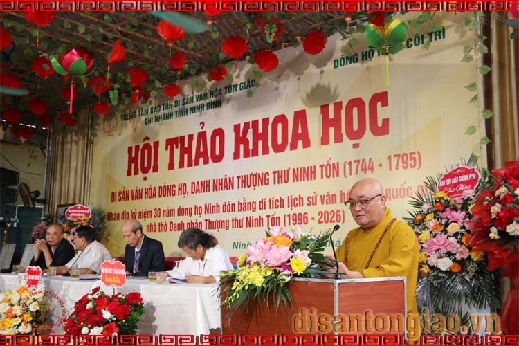 Khép lại Hội thảo khoa học: Di sản văn hóa dòng họ - Thượng thư Ninh Tốn (1744-1795), Đại đức Thạc sĩ Thích Thiện Thông, Phó Giám đốc Trung tâm Bảo tồn Di sản Văn hóa Tôn giáo chia sẻ: Trân trọng ghi nhận công lao của Sư cô Thích Đức Nguyên, Giám đốc Chi nhánh Trung tâm Bảo tồn Di sản Văn hóa Tôn giáo tại Ninh Bình, là hậu duệ thứ mười sáu của dòng họ Ninh ở Côi Trì, xã Yên Mạc, tỉnh Ninh Bình dẫu là người xuất gia nơi cửa Phật, sống đời phạm hạnh thanh tịnh, nhưng Sư cô vẫn luôn giữ trọn đạo hiếu, tri ân và tưởng nhớ công đức sinh thành, dưỡng dục của tổ tiên dòng họ. Chính tinh thần ấy đã góp phần quan trọng trong việc gìn giữ, bảo tồn và lan tỏa giá trị di sản văn hóa truyền thống của dòng họ Ninh đến với cộng đồng và hậu thế.