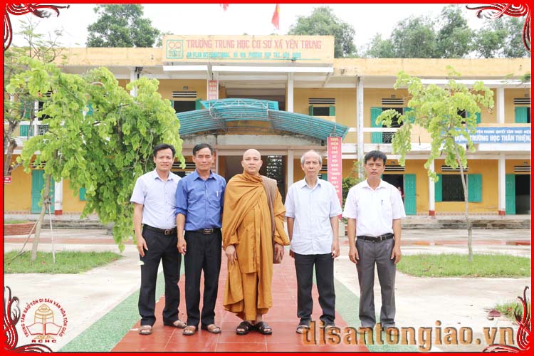 Đại đức Thích Thiện Thông chụp ảnh lưu niệm cùng bác Trần Khánh Dư và thày giáo Lê Thanh Xuyên, Hiệu trưởng Trường Trung học cơ sở xã Yên Trung, huyện Ý Yên, tỉnh Nam Định.
