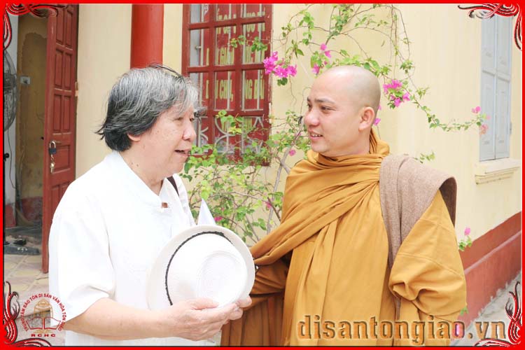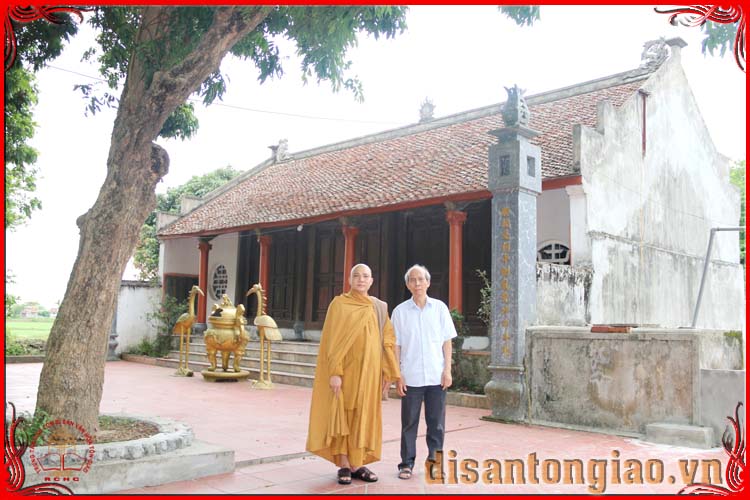 Đại đức Thích Thiện Thông cùng bác Trần Khánh Dư, Giám đốc Trung tâm Bảo tồn Di sản Văn hóa tôn giáo vãng cảnh ngôi chùa tại quê hương Hoàng giáp Trần Hữu Thành.
