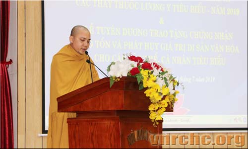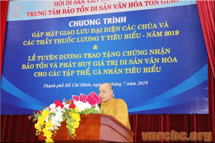 Đại đức Thích Thiện Thông, Giám đốc Văn phòng Đại diện khu vực phía Nam của Trung tâm Bảo tồn Di sản Văn hóa Tôn giáo tham luận tại cuộc giao lưu tổ chức tại Thành phố Hồ Chí Minh ngày 14 tháng 7 năm 2019.