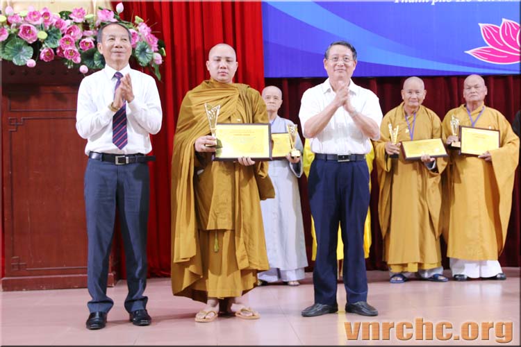 Tiến sĩ Bùi Hữu Dược, Vụ trưởng Vụ Phật giáo Ban Tôn giáo Chính phủ và ông Trần Tấn Hùng, nguyên Phó Trưởng ban Ban Tôn giáo Chính phủ trao tặng bảng chứng nhận cho cá nhân đã có thành tích Bảo tồn và Phát huy giá trị di sản văn hóa Phật giáo Việt Nam tới Đại đức Thích Thiện Thông - Giám đốc Văn phòng Đại diện khu vực phía Nam
