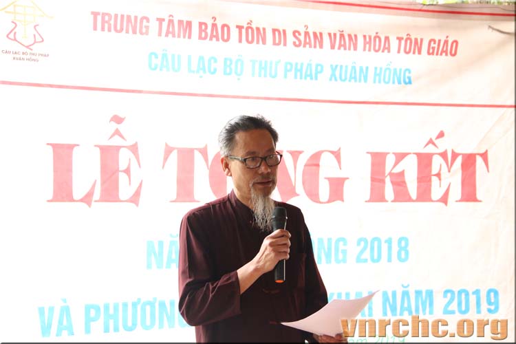 Ông Trần Khánh Dư, Giám đốc Trung tâm Bảo tồn Di sản Văn hóa Tôn giáo phát biểu tại Lễ tổng kết năm hoạt động 2018 của CLB Thư pháp Xuân Hồng và chúc mừng Chủ nhiệm CLB.