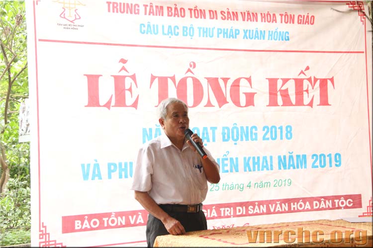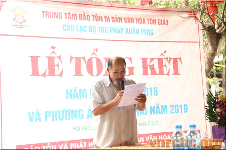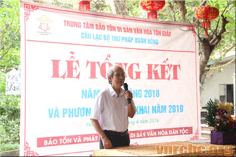 Mở đầu lễ tổng kết, ông Lưu Đức Hạnh, Chủ nhiệm CLB Thư pháp Xuân Hồng phát biểu: Chúng tôi nhận thấy rằng, bao giờ và ở đâu cũng vậy Văn hóa của một dân tộc đều hòa quyện với văn hóa tôn giáo. Cho nên, chúng tôi nêu khẩu hiệu là: Bảo tồn và phát huy giá trị di sản văn hóa Dân tộc và Tôn giáo, lấy đó làm tiêu chí để hoạt động.
