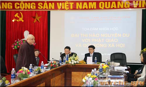1. Chúng ta đã thống nhất với đề tài “Đại thi hào Nguyễn Du với Phật giáo và đời sống xã hội” của chúng ta hôm nay là một Đề tài rất mới, vì từ trước nay nhiều cuộc Hội thảo, tọa đàm, tranh luận cũng chỉ ở lĩnh vực Văn chương, học thuật mà hiếm có một tổ chức/đơn vị nào đề cập đến Phật giáo. Như nhiều tác giả trình bầy thì Đại thi hào Nguyễn Du đã khai thác rất nhiều những nội dung mang tính triết lý Phật giáo, vừa là “LÝ”, vừa là “SỰ”. Nên Đề tài của chúng ta vừa mới, vừa rộng, Tọa đàm của chúng ta đã nói lên được rất nhiều điều, nhưng cũng chỉ như là một bước chấm phá mở đầu.