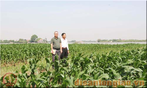 Ông Trần Diên Linh và PGS. TS. Phạm Văn Khoái (trái sang) trên bãi trồng Ngô tại thôn Phù Sa Thượng, xã Hoàng Nam, huyện Nghĩa Hưng, tỉnh Nam Định nơi mà xưa kia Chánh sứ Quảng khuyến Canh nông Trần Hữu Thành chỉ huy công việc trị thủy