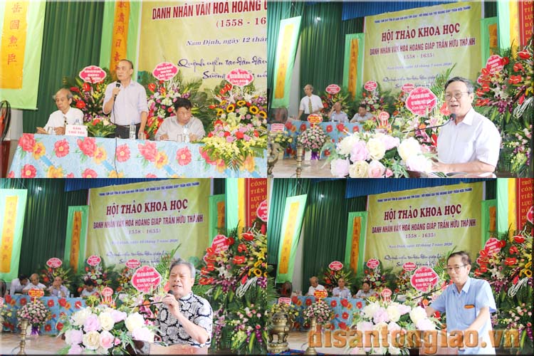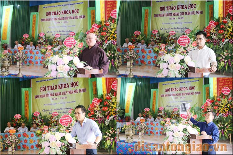 Tham luận, phát biểu của: Hòa thượng Thích Tâm Vượng, Phó Giám đốc Trung tâm Bảo tồn Di sản Văn hóa Tôn giáo; Th.S Nguyễn Đức Bá, Trưởng phòng Nghiên cứu Bảo tồn Di sản, Trung tâm Bảo tồn Di sản Văn hóa Tôn giáo; TS Trần Vinh Dự, hậu duệ đời thứ 11 của Hoàng giáp Trần Hữu Thành; ông Nguyễn Thế Vinh, Trung tâm Bảo tồn Di sản Văn hóa Tôn giáo (từ trái sang, từ trên xuống).