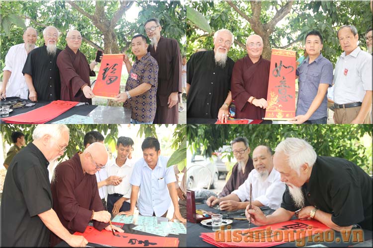 Hòa thượng Thích Tâm Vượng, Cố vấn Câu lạc bộ Thư pháp Xuân Hồng và các thành viên ông Lưu Đức Hạnh, ông Nguyễn Văn Tư, ông Nguyễn Hồng Sơn (Câu lạc bộ Thư pháp Xuân Hồng) viết tặng chữ các vị khách quý, đại biểu tham dự Hội thảo.