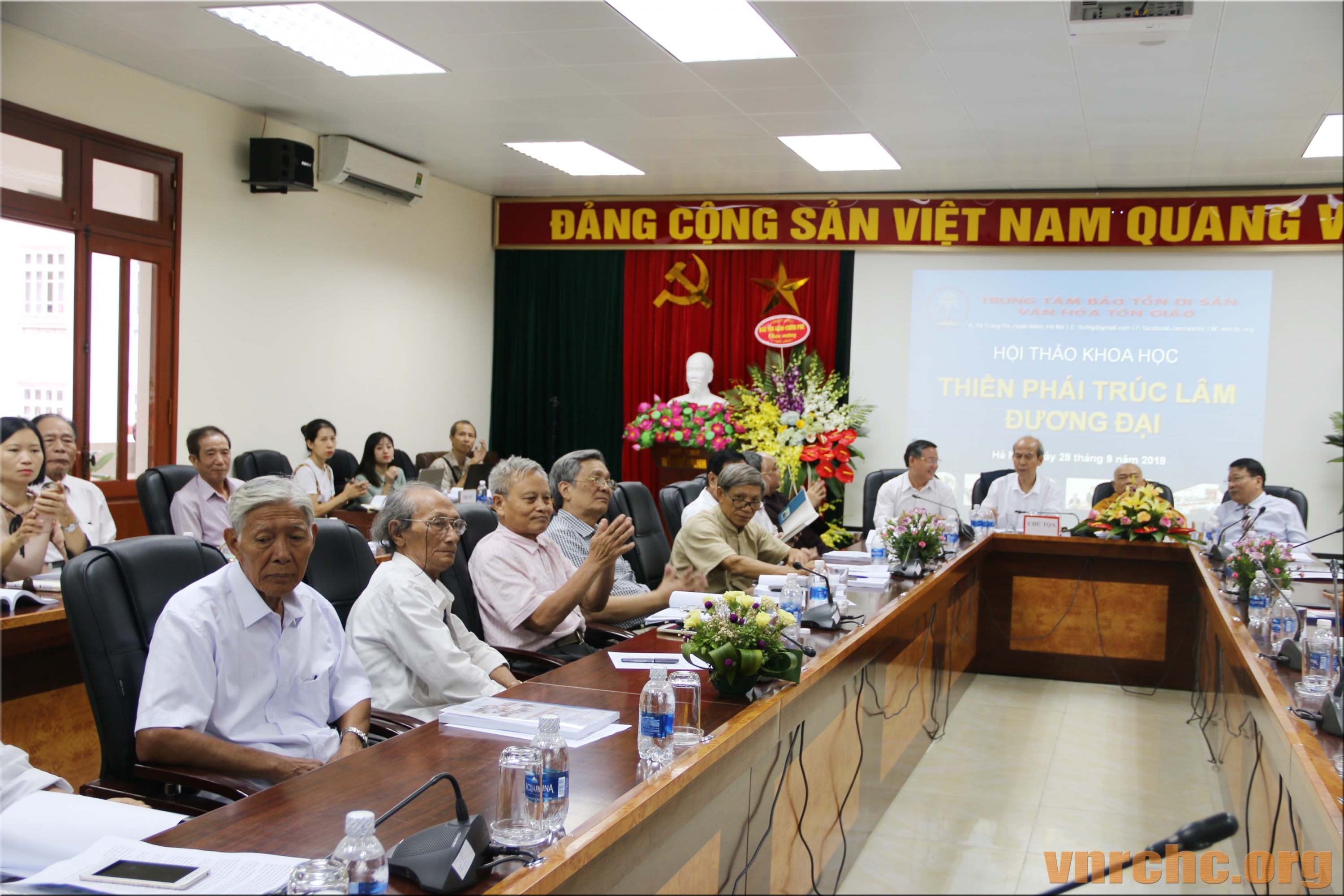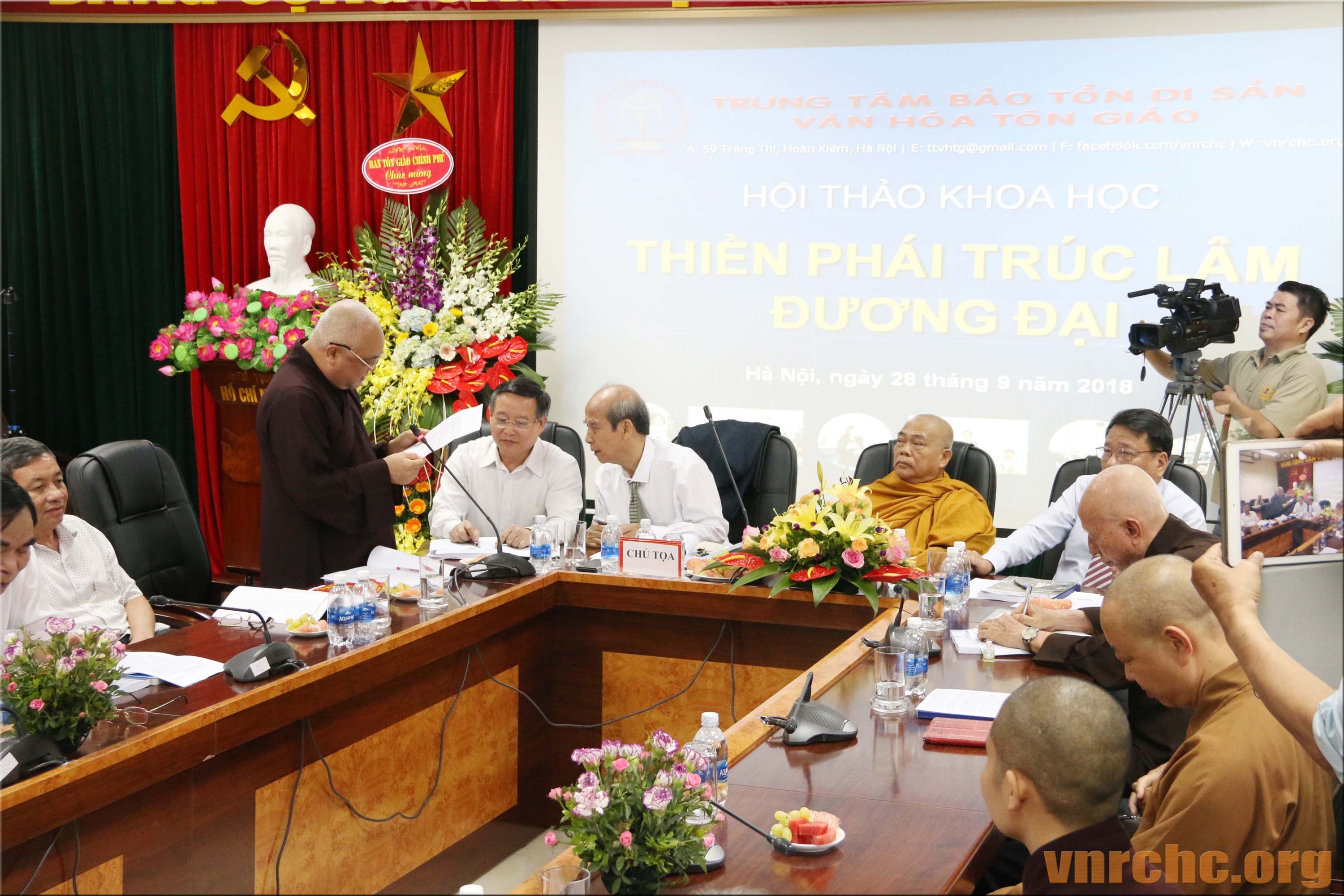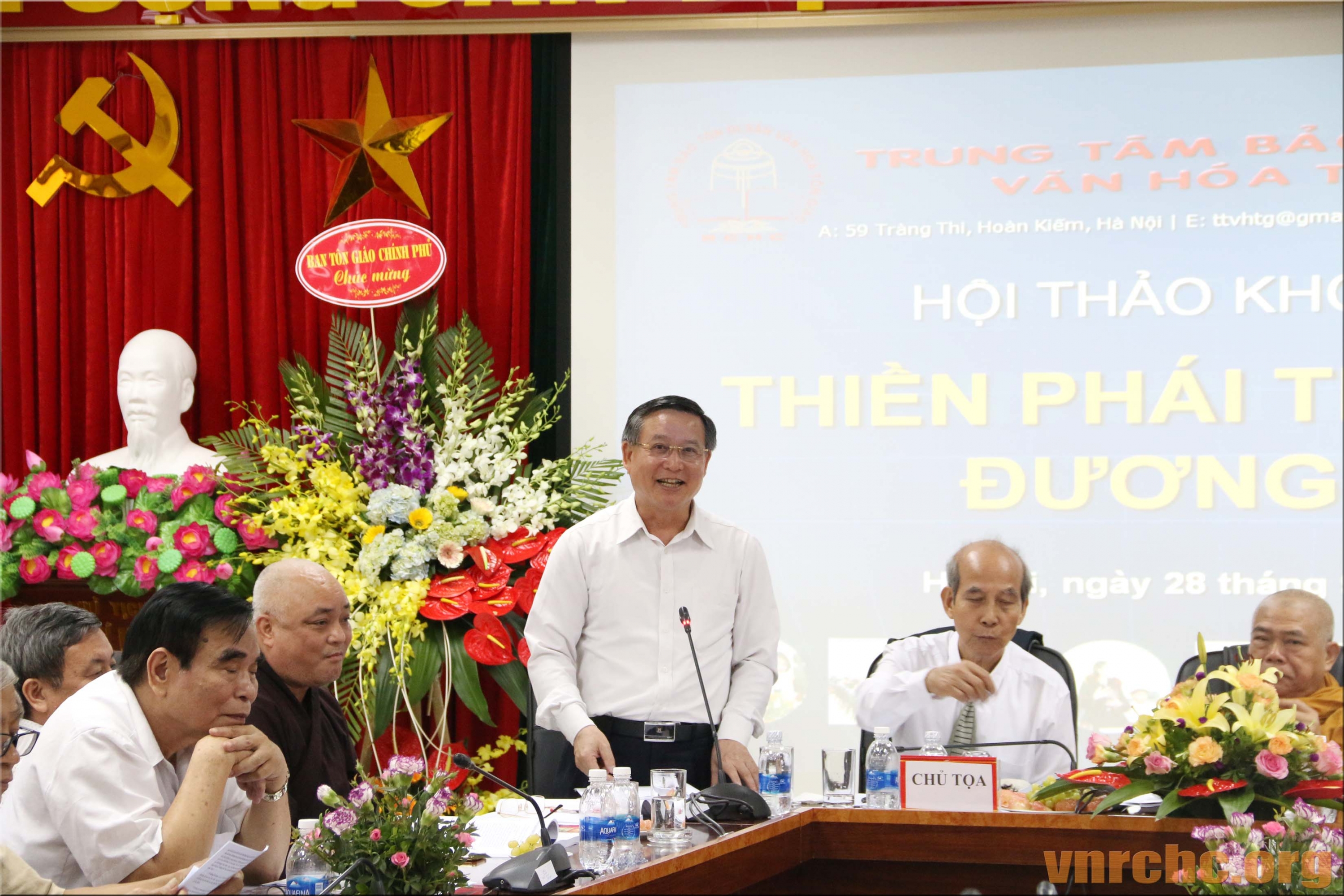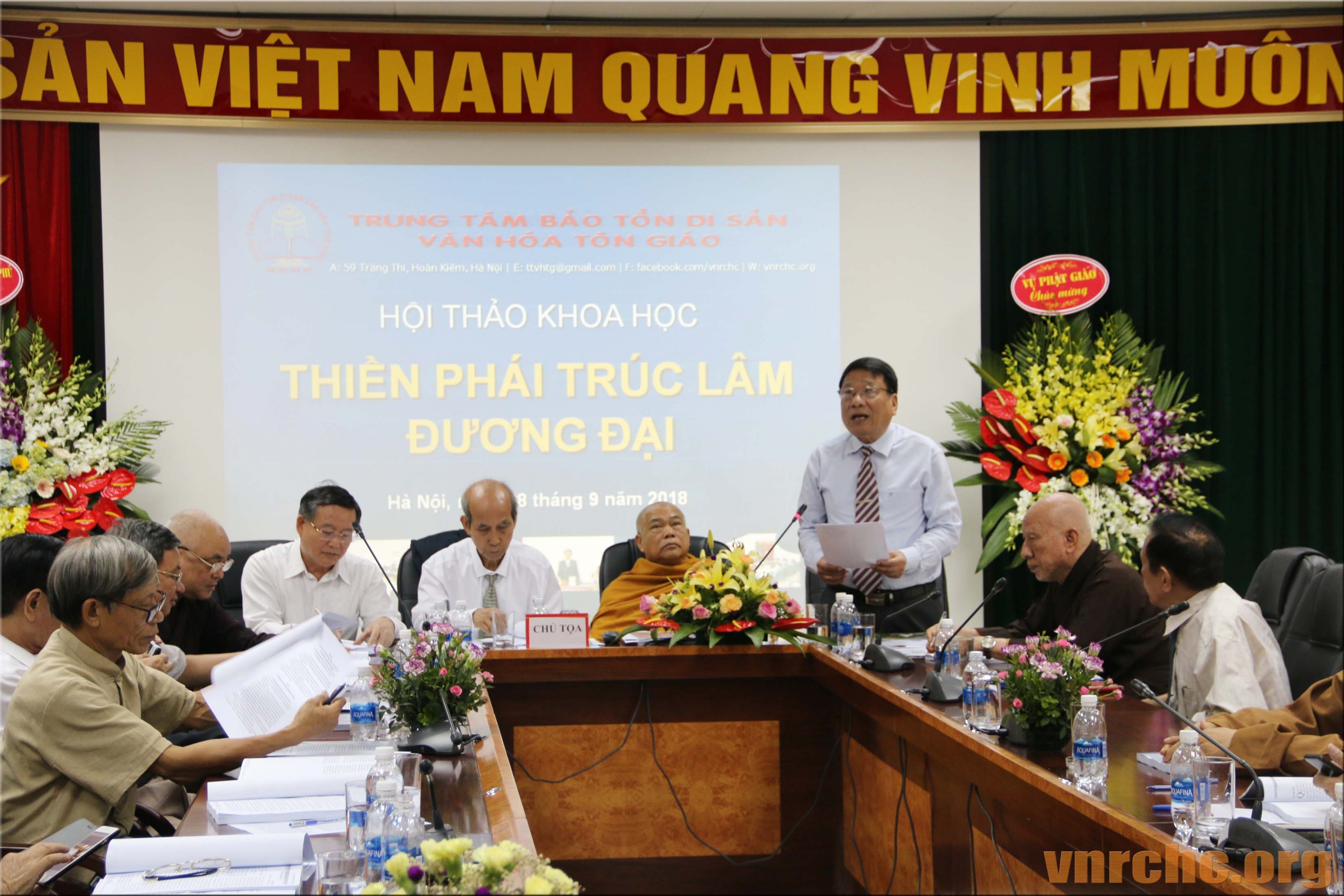 Chủ tọa Hội thảo: ông Trần Khánh Dư, Giám đốc Trung tâm Bảo tồn Di sản Văn hóa Tôn giáo; Hòa thượng Thích Giác Toàn, Phó Chủ tịch Hội đồng Trị sự Giáo hội Phật giáo Việt Nam, Viện trưởng viện Nghiên cứu Phật học Việt Nam; PGS.TS Đặng Văn Bài, Phó Chủ tịch Hội Di sản Văn hóa Việt Nam; và, ông Bùi Hữu Dược, Vụ trưởng Vụ Phật giáo, Ban Tôn giáo Chính phủ.