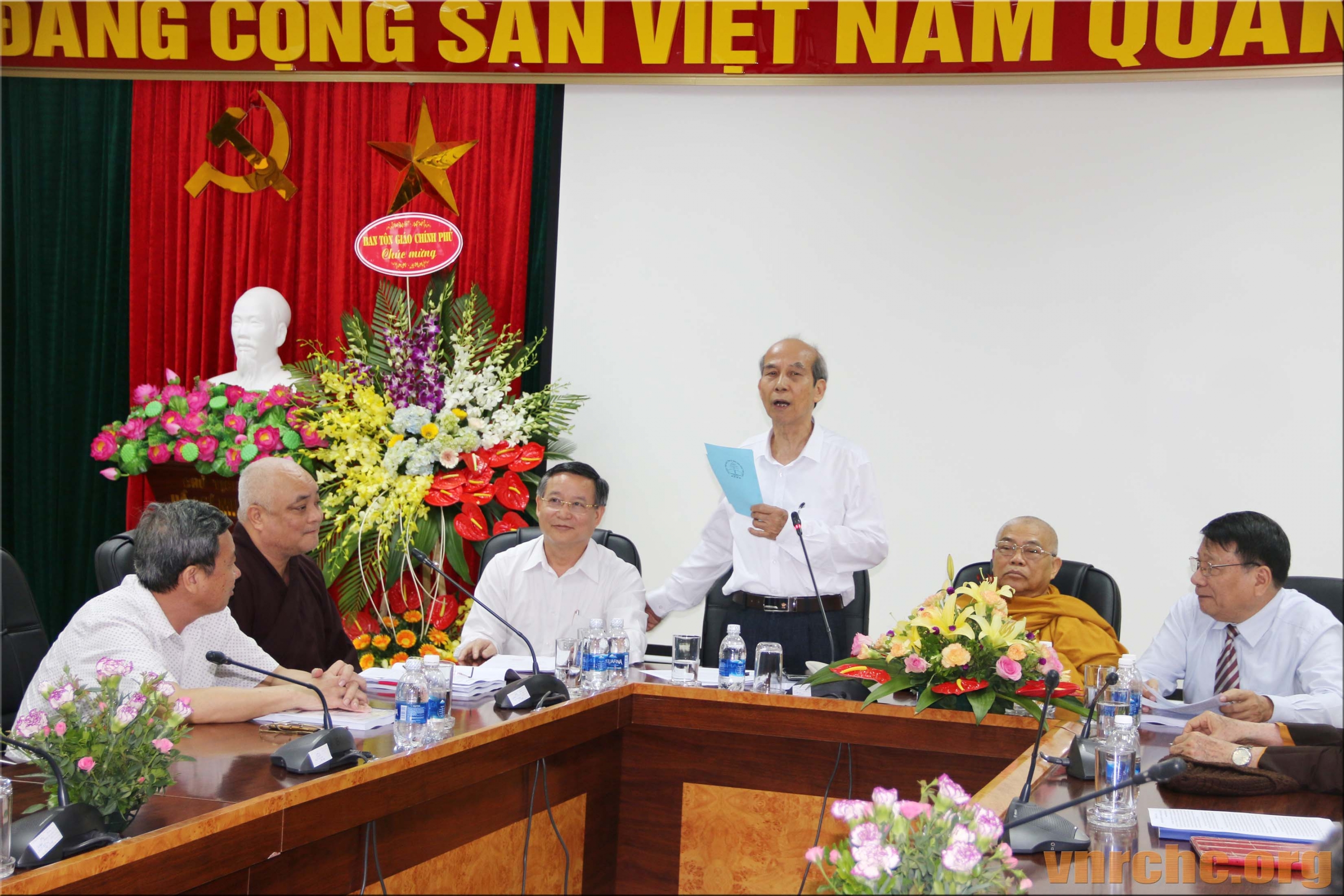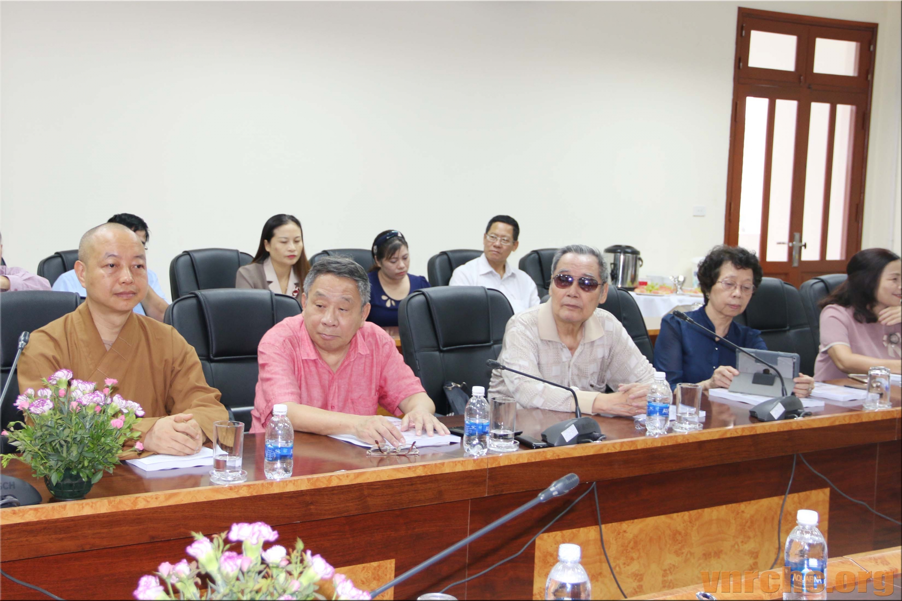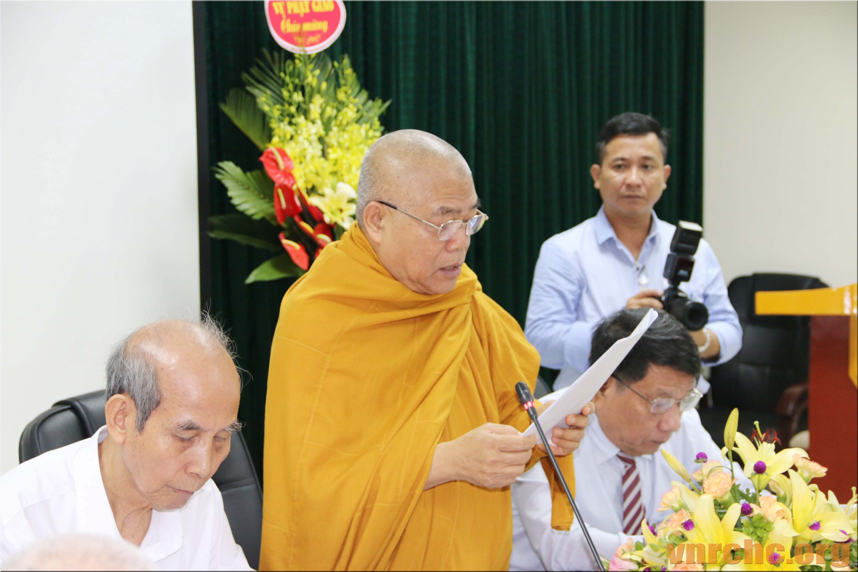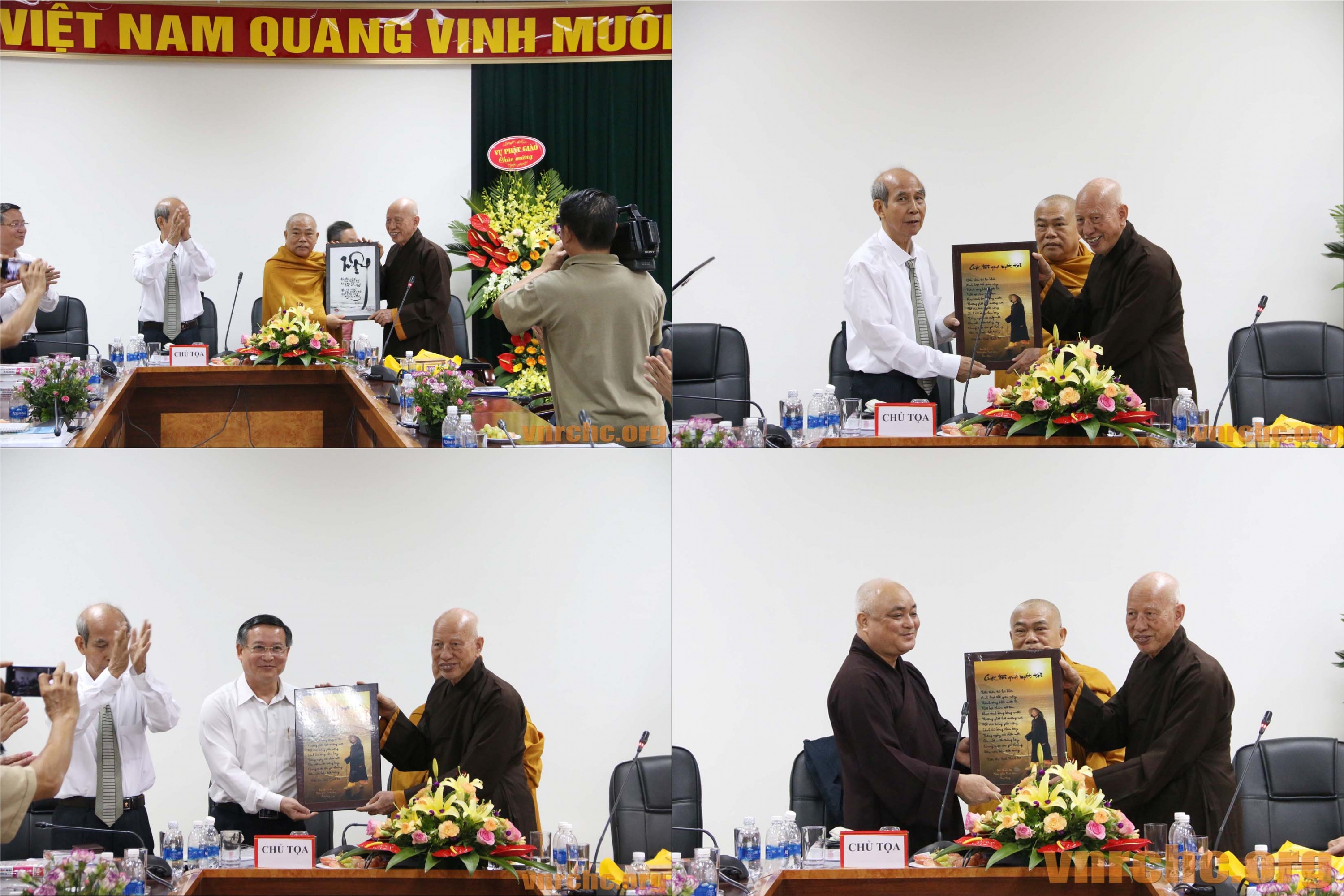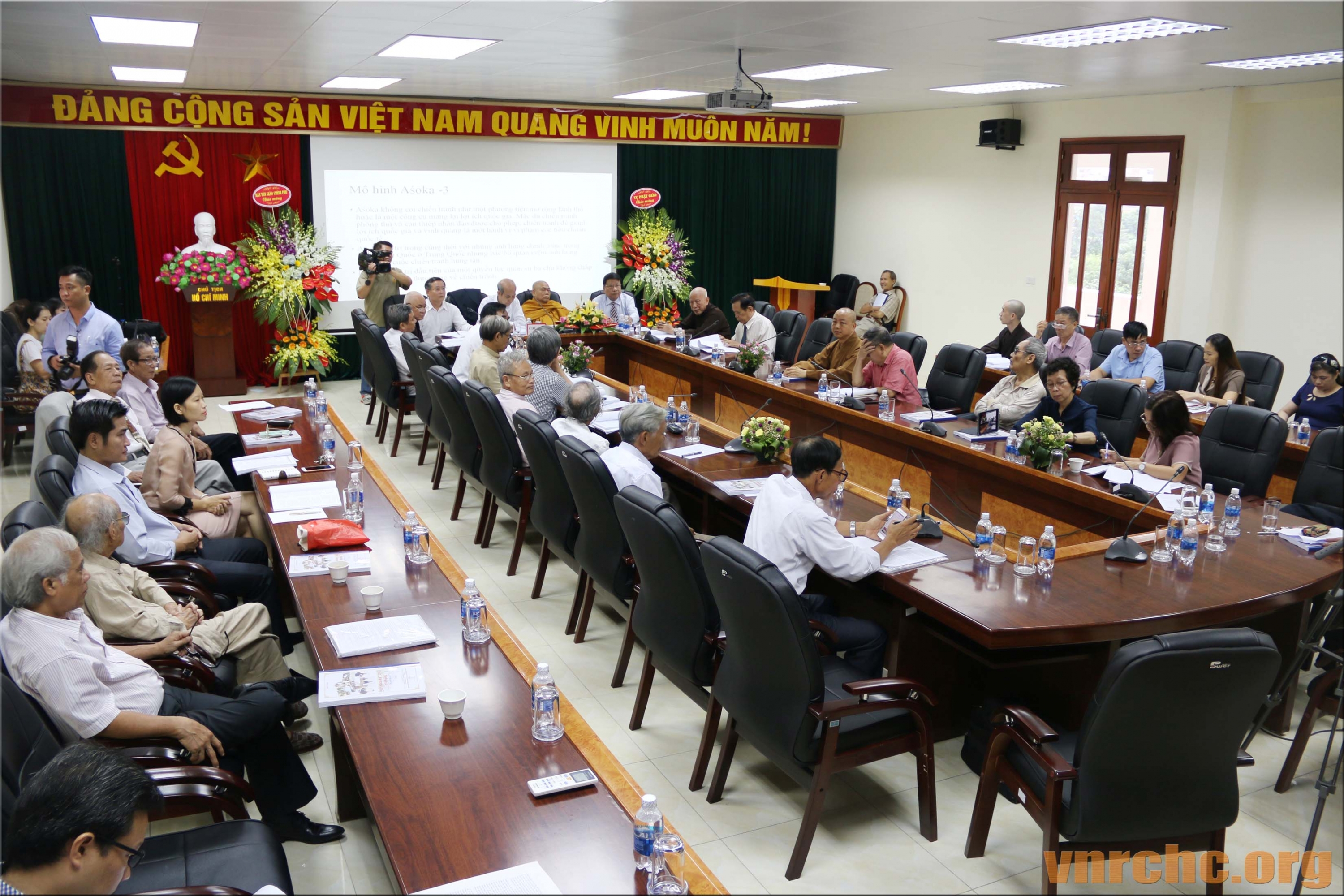Chủ tọa Hội thảo: ông Trần Khánh Dư, Giám đốc Trung tâm Bảo tồn Di sản Văn hóa Tôn giáo; Hòa thượng Thích Giác Toàn, Phó Chủ tịch Hội đồng Trị sự Giáo hội Phật giáo Việt Nam, Viện trưởng viện Nghiên cứu Phật học Việt Nam; PGS.TS Đặng Văn Bài, Phó Chủ tịch Hội Di sản Văn hóa Việt Nam; và, ông Bùi Hữu Dược, Vụ trưởng Vụ Phật giáo, Ban Tôn giáo Chính phủ.
