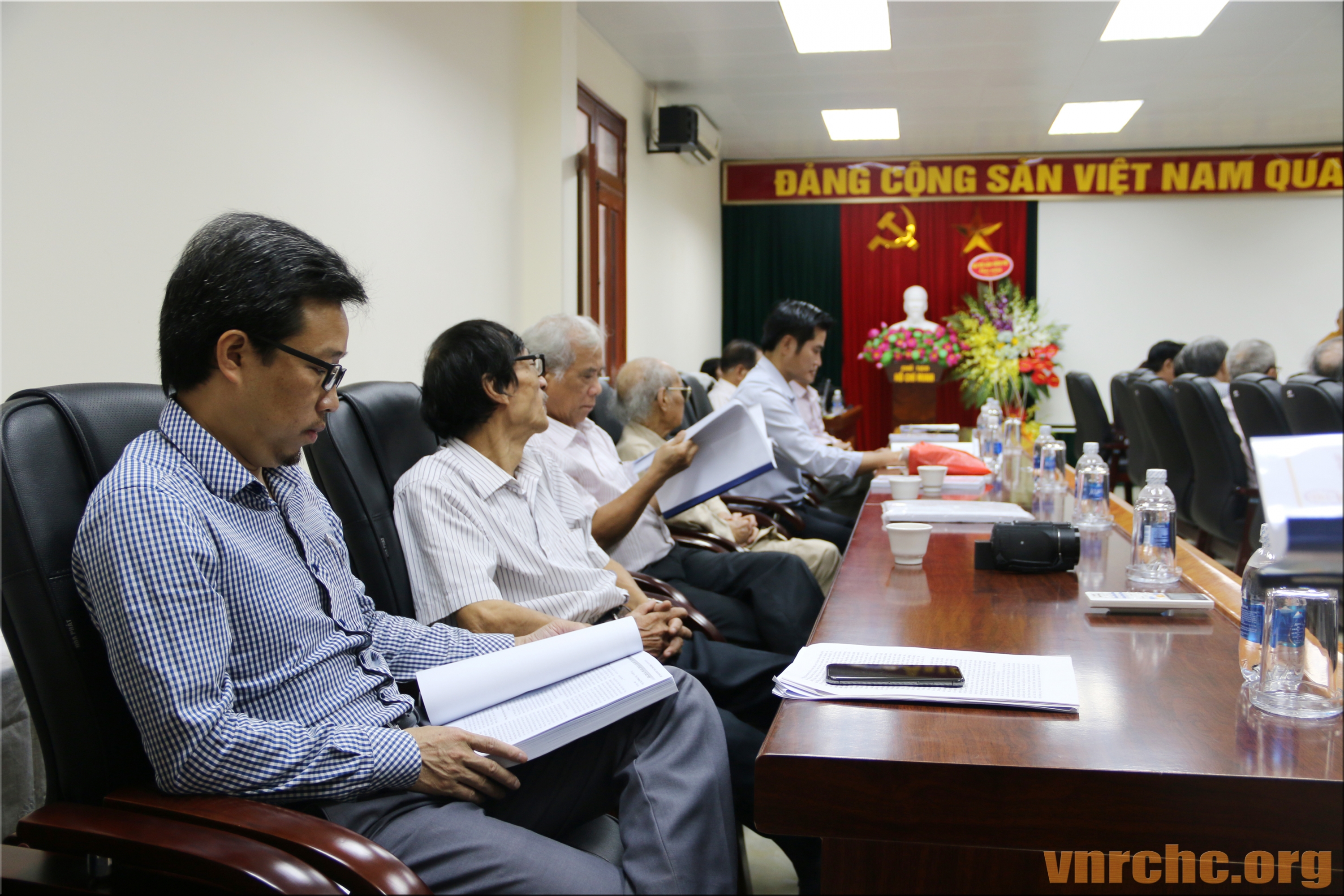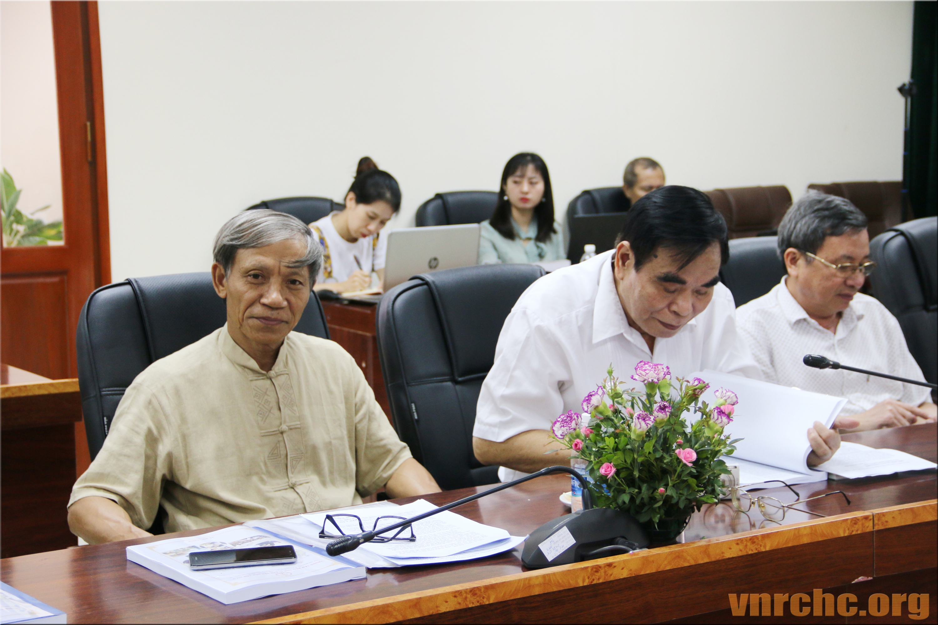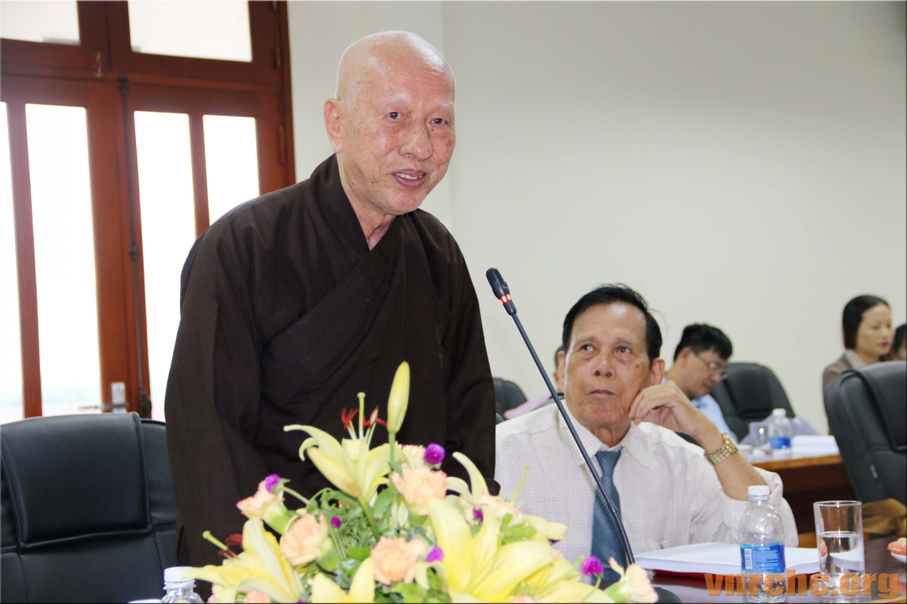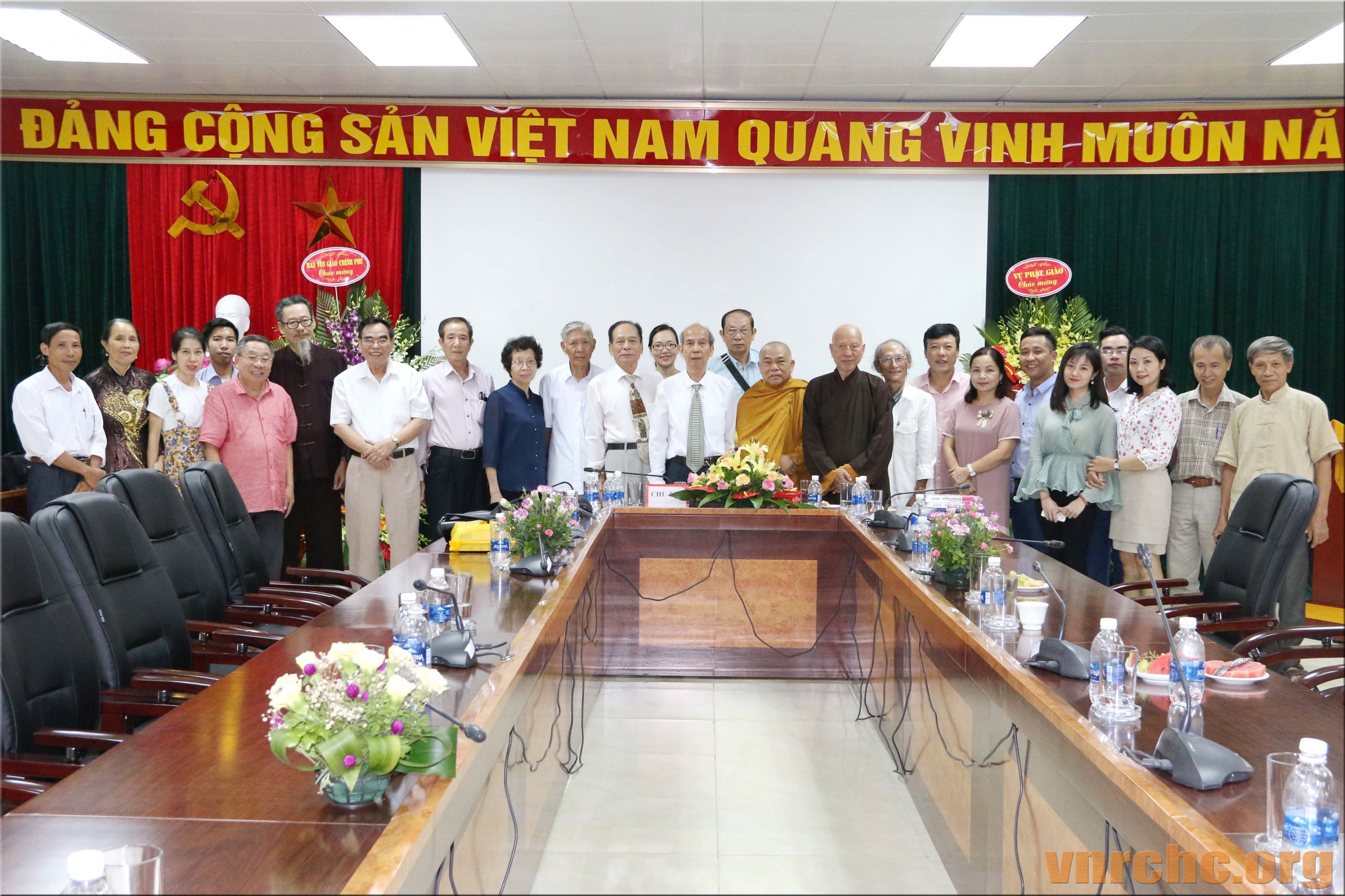 Chủ tọa Hội thảo: ông Trần Khánh Dư, Giám đốc Trung tâm Bảo tồn Di sản Văn hóa Tôn giáo; Hòa thượng Thích Giác Toàn, Phó Chủ tịch Hội đồng Trị sự Giáo hội Phật giáo Việt Nam, Viện trưởng viện Nghiên cứu Phật học Việt Nam; PGS.TS Đặng Văn Bài, Phó Chủ tịch Hội Di sản Văn hóa Việt Nam; và, ông Bùi Hữu Dược, Vụ trưởng Vụ Phật giáo, Ban Tôn giáo Chính phủ.
