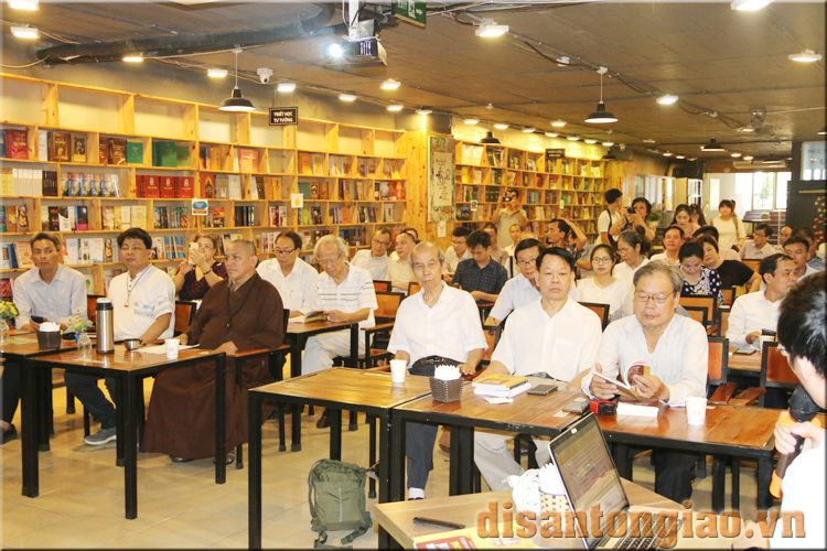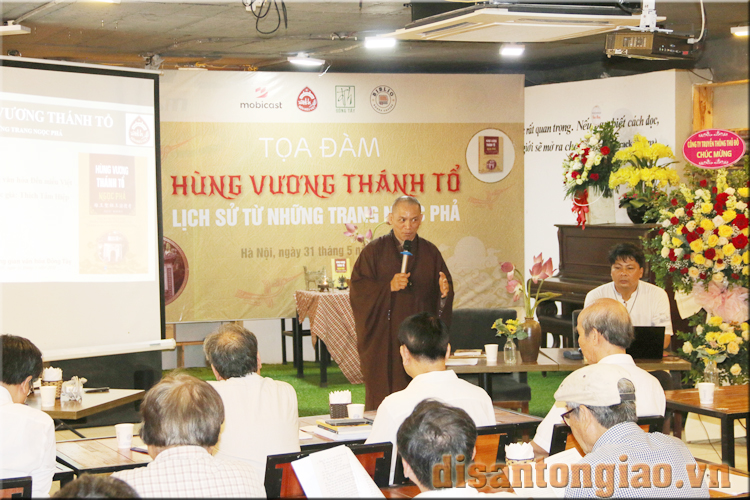 Khung cảnh cuộc Tọa đàm: Hùng Vương Thánh Tổ - Lịch sử từ những trang Ngọc phả. Hàng trên bên trái: Thượng tọa Thích Tâm Hiệp cùng Nhóm Tác giả; bên phải: Ông Trần Khánh Dư, Giám đốc Trung tâm Bảo tồn Di sản Văn hóa Tôn giáo cùng các vị khách.