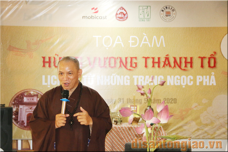 Thượng tọa Thích Tâm Hiệp chia sẻ các công việc đã tiến hành trong quá trình nghiên cứu thực địa để hoàn thành cuốn sách Hùng Vương Thánh Tổ Ngọc Phả.