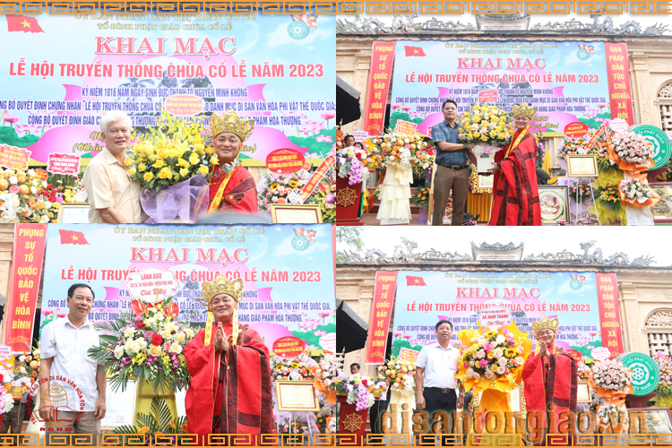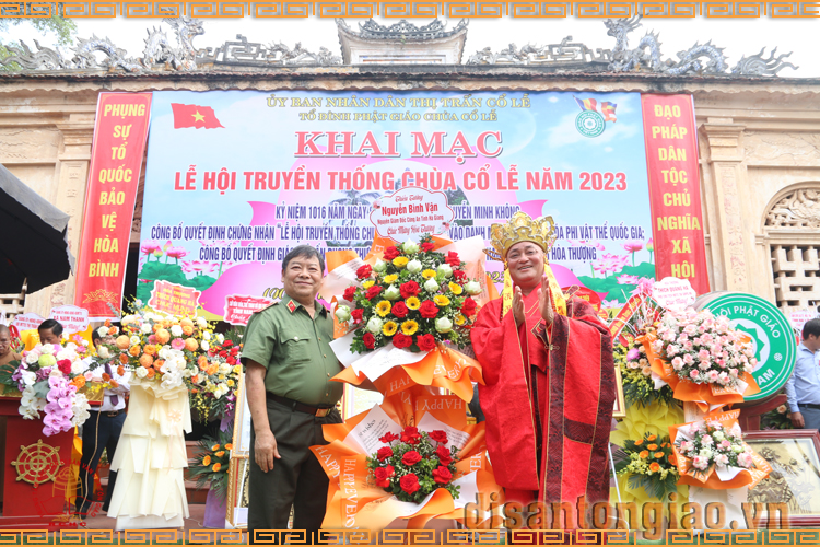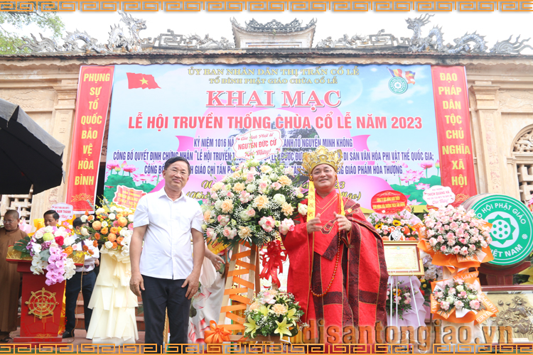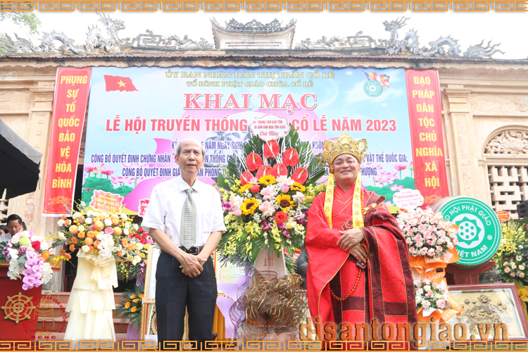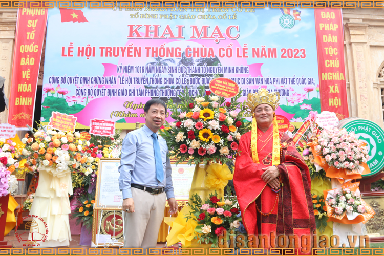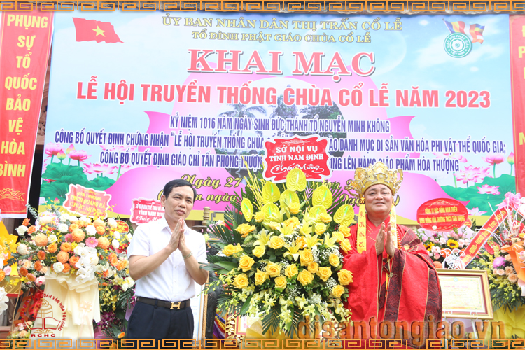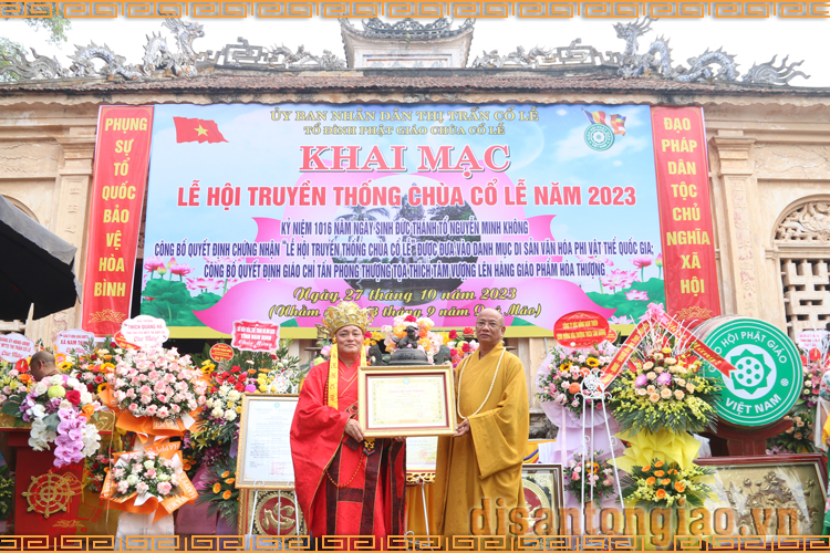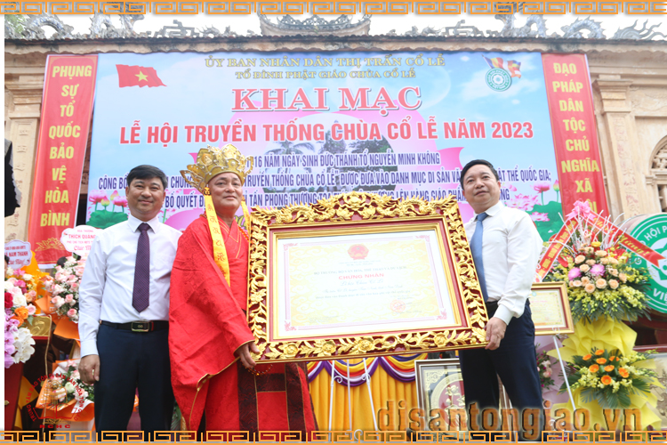 Ông Nguyễn Tiến Dũng, Giám đốc Sở Văn hóa, Thể thao và Du lịch tỉnh Nam Định (bên phải), Ông Nguyễn Quang Trình, Trưởng Ban Tổ chức lễ hội chùa Cổ Lễ trao giấy chứng nhận Lễ hội chùa Cổ Lễ được đưa vào danh mục Di sản văn hóa phi vật thể tới Hòa thượng Thích Tâm Vượng, Trụ trì chùa Cổ Lễ.