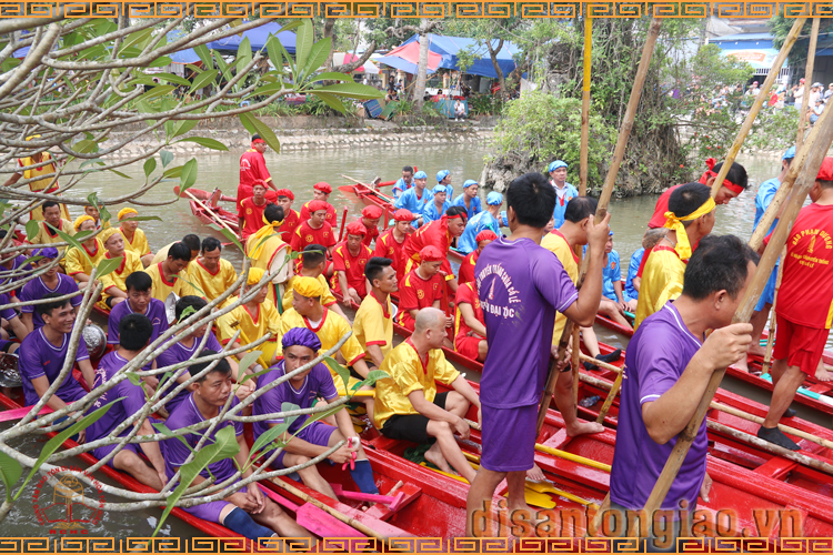 Các đội đua thuyền chuẩn bị cuộc đua ngày đầu tiên. Có 4 đội là 4 dòng họ lớn hiện đang sinh sống tại thị trấn Cổ Lễ, huyện Trực Ninh, tỉnh Nam Định.