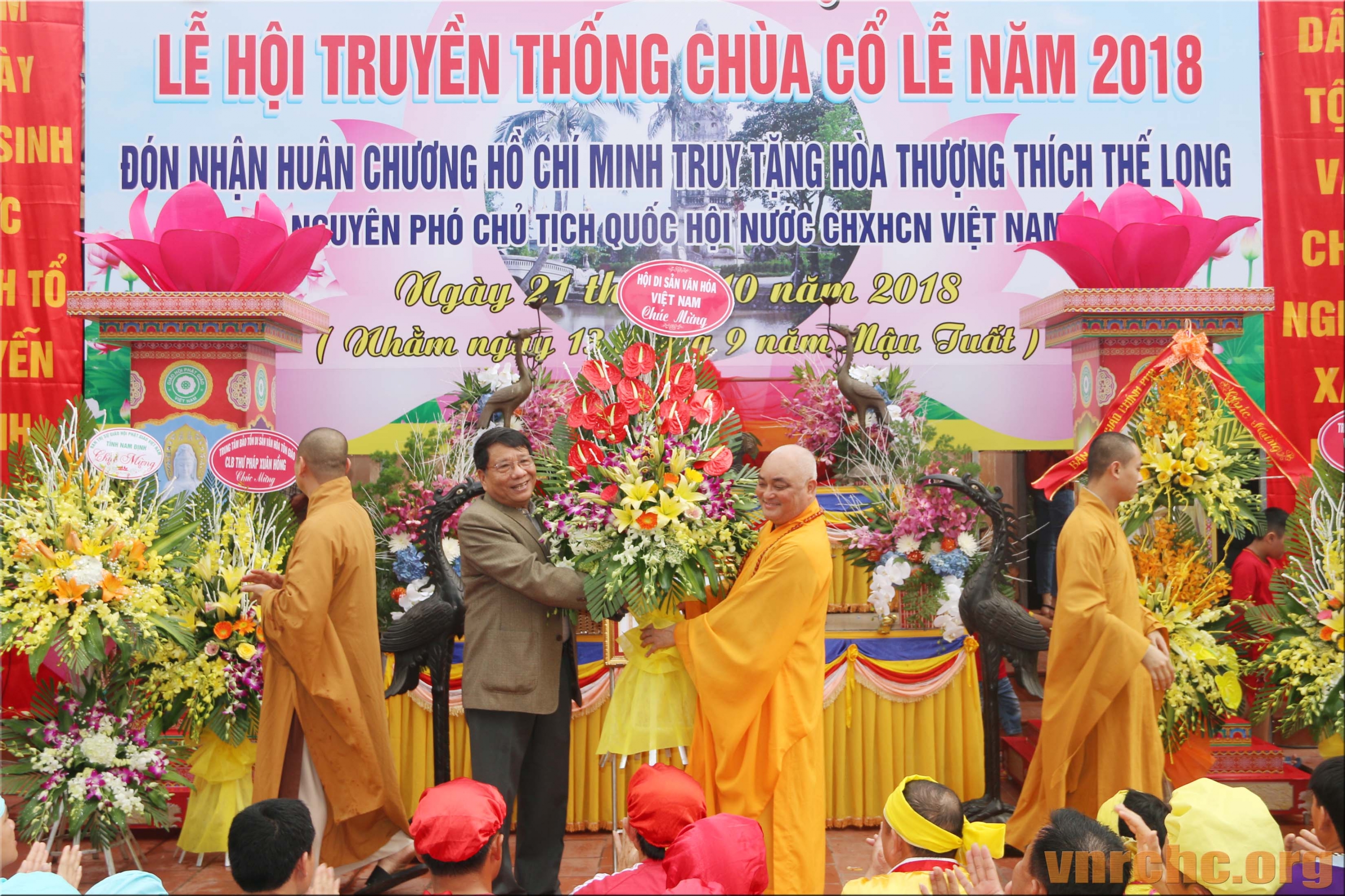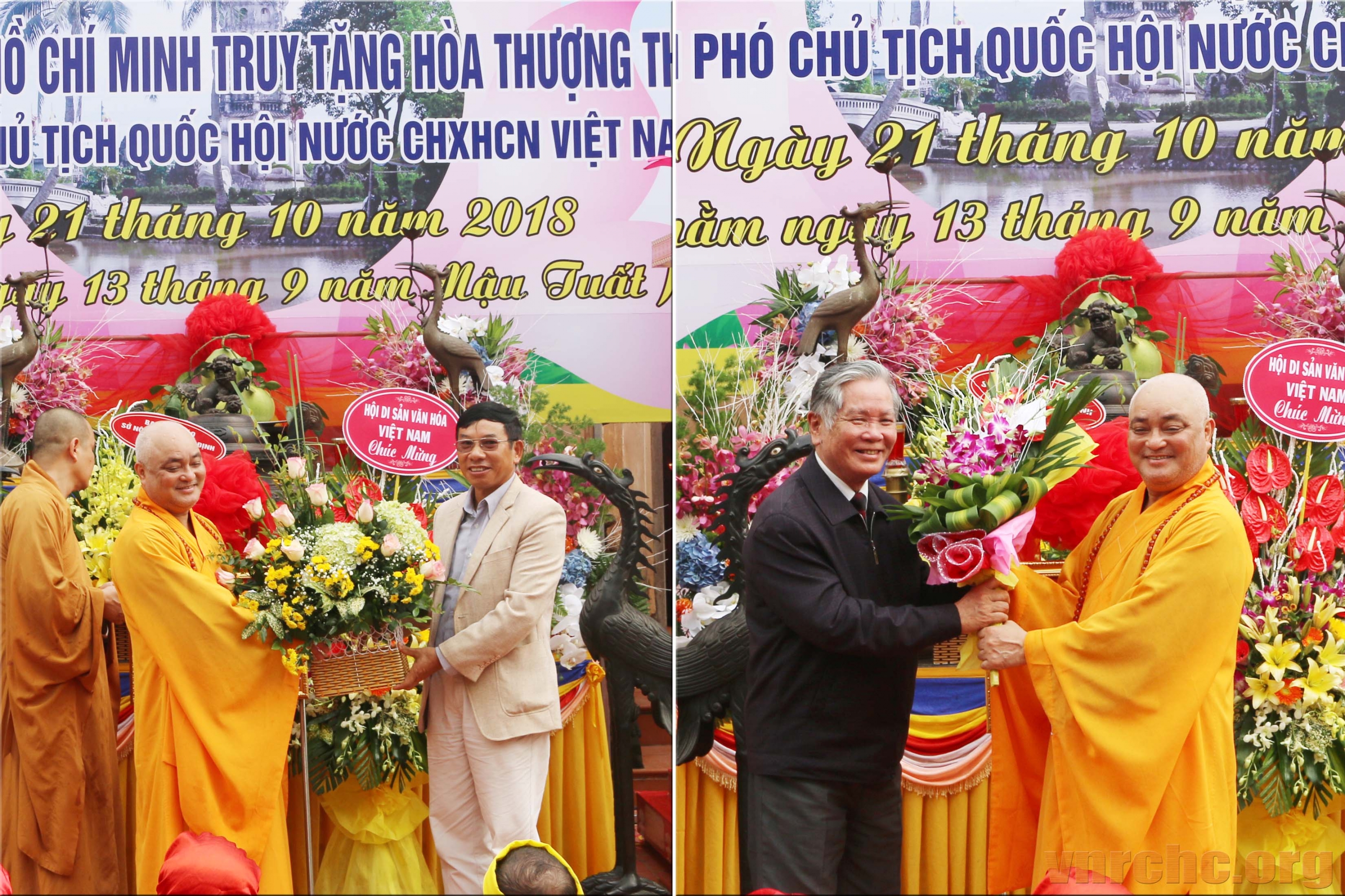 PGS.TS Đặng Văn Bài, Phó Chủ tịch Hội Di sản Văn hóa Việt Nam tặng hoa chúc mừng lễ hội tới Thượng tọa Thích Tâm Vượng.