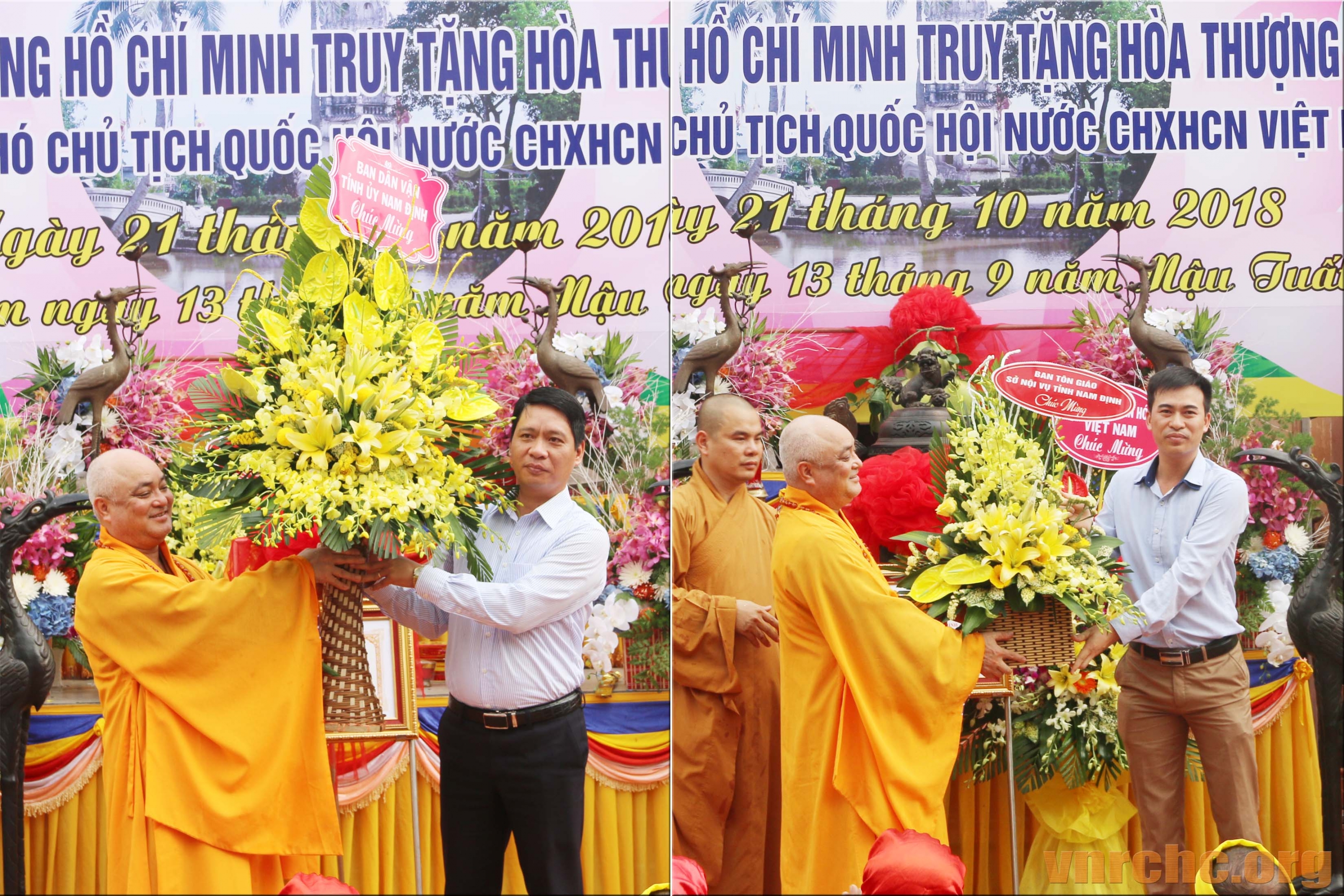 Ông Ngô Ngọc Vũ, Phó Trưởng ban Ban Dân vận Tỉnh ủy; ông Đặng Lê Ca, Phó Trưởng phòng Nghiệp vụ Ban Tôn giáo tỉnh Nam Định tặng hoa chúc mừng lễ hội tới Thượng tọa Thích Tâm Vượng.