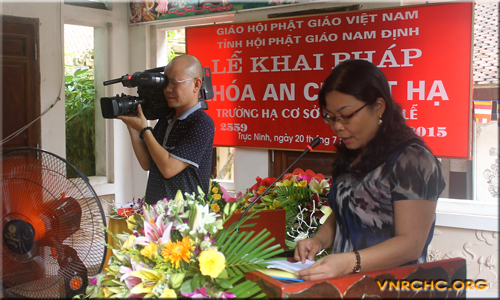 Bà Nguyễn Thị Kim Dung, Huyện ủy viên, PCT MTTQ huyện Trực Ninh đọc quyết định khen thưởng Bằng khen của Ông Nguyễn Thiện Nhân, Chủ tịch MTTQ Việt Nam tới Thượng tọa Thích Tâm Vượng.