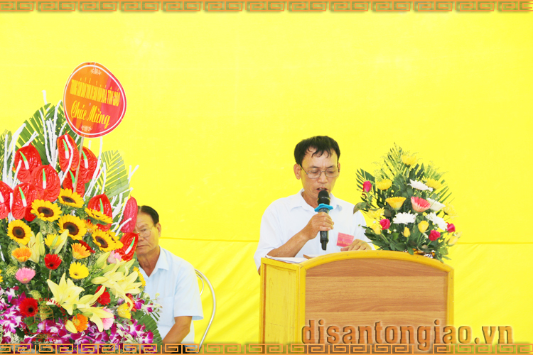 Ông Trịnh Đình Mạnh lên báo cáo kinh tế tài chính tại Lễ mừng công mái thượng ngôi Tam Bảo chùa Bảo Sơn, làng Thủy Nhai, xã Xuân Thủy, huyện Xuân Trường, tỉnh Nam Định.