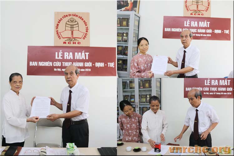 Sau một thời gian chuẩn bị Đề án thành lập Ban và sự chấp thuận của Hội Di sản Văn hóa Việt Nam, hôm nay, ngày 08/7/2019 tại Văn phòng Trung tâm Bảo tồn Di sản Văn hóa Tôn giáo tổ chức Lễ ra mắt Ban Nghiên cứu thực hành Giới - Định - Tuệ trong Phật tử tại gia (sau đây gọi tắt là Ban Nghiên cứu thực hành Giới - Định - Tuệ). Tại lễ ra mắt, Giám đốc Trung tâm Bảo tồn Di sản Văn hóa Tôn giáo trao Quyết định thành lập Ban và Quyết định bổ nhiệm nhân sự.