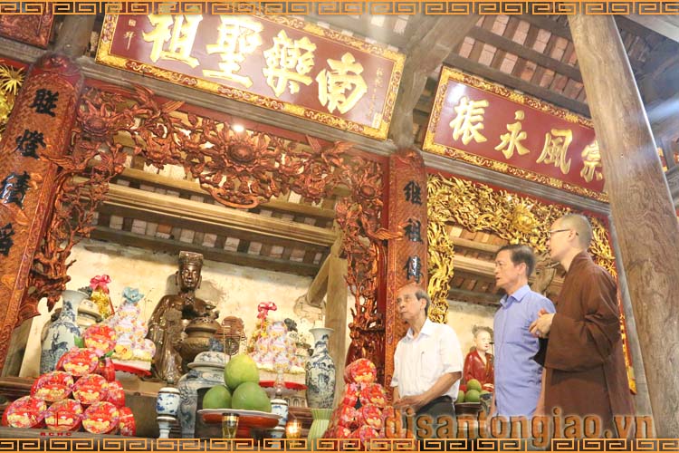 Ông Trần Khánh Dư, Giám đốc Trung tâm; ông Nguyễn Đắc Tuấn, Phó Giám đốc và Đại đức Thạc sĩ Thích Tâm Nguyện dâng nhang tại nơi thờ Đại Danh y - Thiền sư Tuệ Tĩnh tại chùa Giám ngày 14/6/2023 (trái sang).