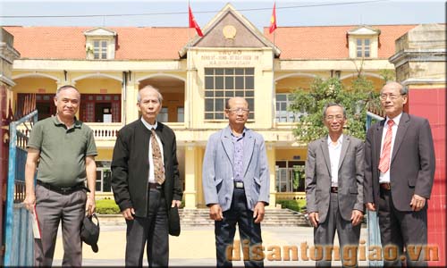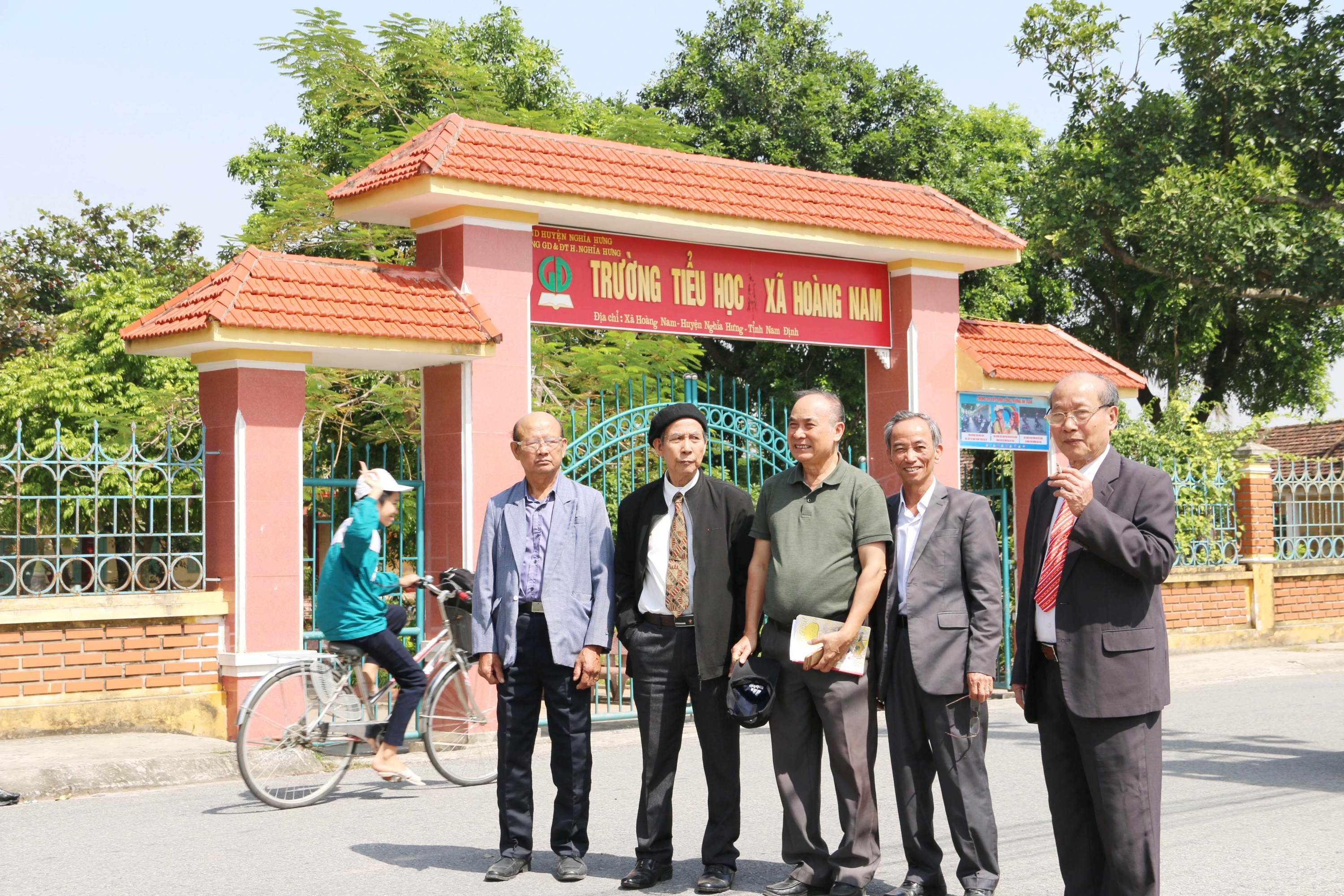 PGS.TS Phạm Văn Khoái (đứng giữa) cùng hậu duệ đời thứ mười của Hoàng giáp Trần Hữu Thành (từ trái sang: ông Trần Văn Đề, ông Trần Khánh Dư, ông Trần Văn Vịnh và ông Trần Thanh Tân) chụp hình lưu niệm trước cổng Trường Tiểu học xã Hoàng Nam, huyện Nghĩa Hưng, tỉnh Nam Định.