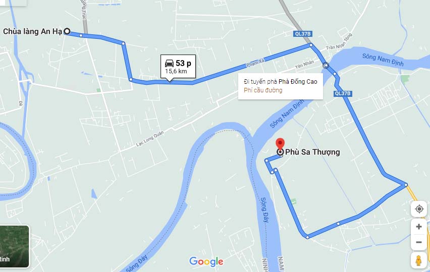 Đồ họa quãng đường đi từ thôn An Hạ (chùa làng An Hạ, xã Yên Đồng, huyện Ý Yên, tỉnh Nam Định) đến thôn Phù Sa Thượng (xã Hoàng Nam, huyện Nghĩa Hưng, tỉnh Nam Định) chuyến đi ngày 24 tháng 10 năm 2020 (ảnh: Google Map)