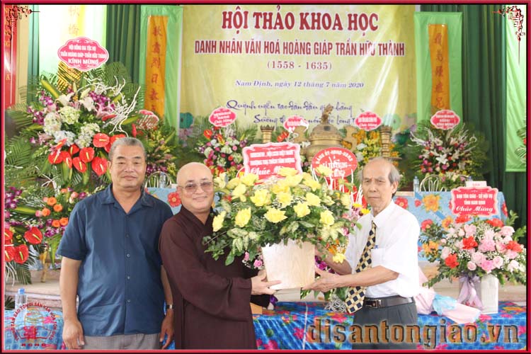 Hòa thượng Thích Tâm Vượng, Ủy viên Hội đồng Trị sự Trung ương Giáo hội Phật giáo Việt Nam tặng hoa tới ông Trần Khánh Dư tại sự kiện Hội thảo Khoa học Danh nhân Văn hóa Hoàng giáp Trần Hữu Thành (1558-1635).