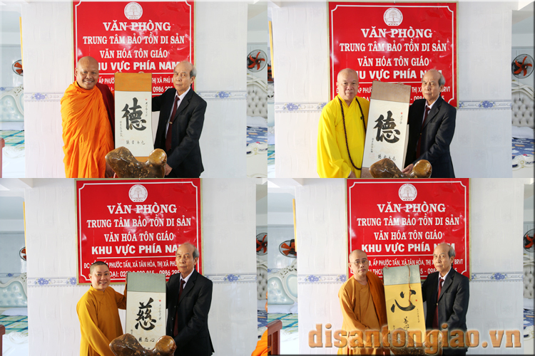 Ông Trần Khánh Dư, Giám đốc Trung tâm tặng các bức Thư pháp tới các nhân sự của Văn phòng Đại diện phía Nam: Thượng tọa Thích Nguyên Thái, Phó Trưởng Ban Trị sự GHPGVN tỉnh BR-VT; Bà Nguyễn Thị Bảy, Trưởng Ban Kinh tế Tài chính; ông Lại Nhựt Trường, Chủ tịch CLB Hội Từ thiện Hành Trình Việt; ông Phạm Thanh Qui, Trưởng Hội Từ thiện Trái tim Từ Bi (trái sang, trên xuống).