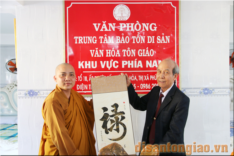 Ông Trần Khánh Dư, Giám đốc Trung tâm tặng bức Thư pháp tới Đại đức Thích Thiện Thông, Giám đốc Văn phòng Đại diện phía Nam, Giám đốc Trung tâm Nhân đạo Hồng Quang, Trụ trì chùa Hồng Quang - nơi đặt Văn phòng Đại diện Trung tâm Bảo tồn Di sản Văn hóa Tôn giáo phía Nam.