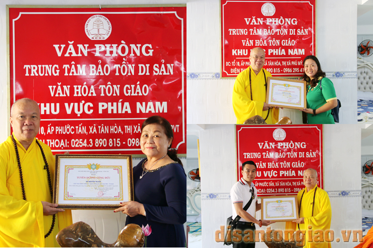 Vừa qua, Văn phòng Đại diện phía Nam (VPĐD) thuộc Trung tâm Bảo tồn Di sản Văn hóa Tôn giáo tổ chức Lễ trao Bằng khen của Hội Di sản Văn hóa Việt Nam và Giấy khen của Trung tâm cho các cá nhân và tập thể đã có nhiều đóng góp tích cực trong hoạt động bảo vệ và phát huy giá trị di sản văn hóa dân tộc; và, trong công tác từ thiện xã hội diễn. Lễ trao tặng được tổ chức sáng ngày 13/01/2020 tại xã Tân Hòa, thị xã Phú Mỹ, tỉnh Bà Rịa - Vũng Tàu.