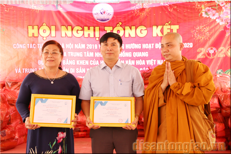 Khung cảnh lễ tổng kết hoạt động của Trung tâm Nhân đạo Hồng Quang, trao tặng Bằng khen của Hội Di sản Văn hóa Việt Nam và Giấy khen của Trung tâm Bảo tồn Di sản Văn hóa Tôn giáo cho các tập thể và cá nhân đã có nhiều đóng góp tích cực trong hoạt động bảo vệ và phát huy giá trị di sản văn hóa dân tộc; và, trong công tác từ thiện xã hội - năm 2019.